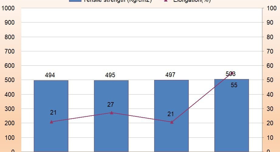 1. Experimental and Objectives1.1. To granulate with a twin-screw granulator the poorly compatible PC and ABS into PC/ABS blend. Thereafter, standard test pieces were produced using a 150-ton horizontal motor in order to examine its mechanical performance such as tensile, bending strength and impact resistance. 1.2. This investigation aimed to evaluate whether 1500BC-PP can be used as a surface active agent (surfactant) to improve the compatibility between PC and ABS, which are usually badly compatible with each other, with a further objective to largely improve the mechanical properties of the PC/ABS blend. 2. Results and Discussion2.1. The performance of PC/ABS blend is determined by the compatibility of the 2 constituent polymeric materials. If well-compatible, the physical and mechanical performances of PC/ABS will lie between PC and ABS. If badly-compatible, PC/ABS will have mostly lower physical and mechanical performances than PC and ABS. The function of the surface active agent is to enhance the compatibility between PC and ABS. Adding 1500BC-PP, the mechanical properties of the blend of PC and ABS can be largely elevated, meaning that 1500BC-PP can serve as the surface active agent to blend PC and ABS. 2.2. The increased addition of 1500BC-PP has led to significant increases of the elongation rate and impact strength of PC/ABS blend. The impact strength of commercially available PC/ABS is usually 35~55 kg-cm/cm.2.3. The tensile strength, bending strength and bending elasticity of PC/ABS varied little or slightly increased with increasing addition of 1500BC-PP